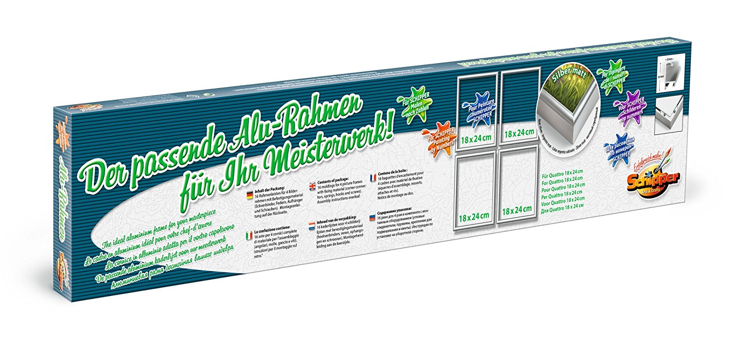Každý obraz je len vtedy naozaj ocenený, keď je pekne zarámovaný. Výber vhodného rámu je pri dnešnej možnosti výberu naozaj ťažký. SCHIPPER Arts & Crafts zvolil hliníkový rám, ktorý sa hodí nie len ku všetkým motívom malieb namaľovaných podľa čísel, ale aj k akémukoľvek bytovému vybaveniu. Eloxovaný rám v zlatej a striebornej farbe prepožičiava každej maľbe so svojim úzkym profilom vyjadrovaciu silu a zároveň ju decentným spôsobom zarámuje. Rámy sú dodávané ako jednotlivé lišty pre jednoduchú vlastnú montáž. Každé balenie obsahuje všetky potrebné úchytné komponenty, spolu s návodom na montáž. K dispozícií sú rámy v rozmeroch 24/30 cm, 40/50 cm, 50/60 cm, 40/80 cm, Triptych 50/80 cm, Triptych 120/40 cm a Quattro 18/24 cm.
